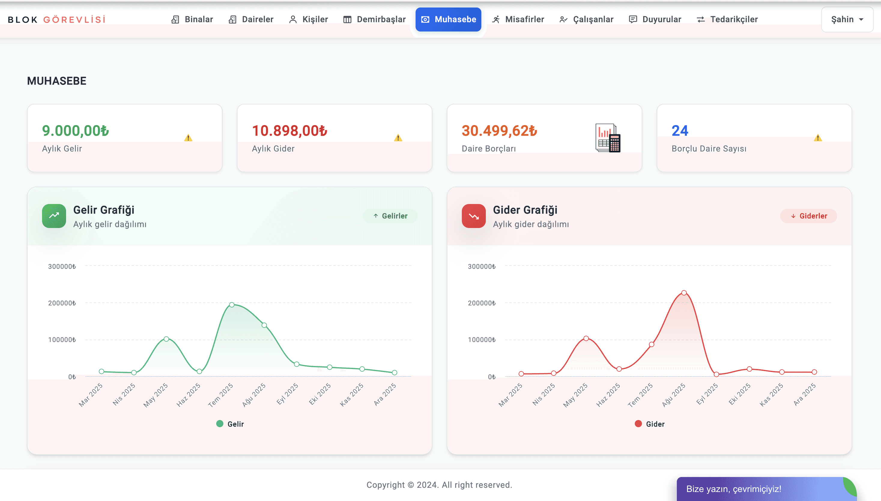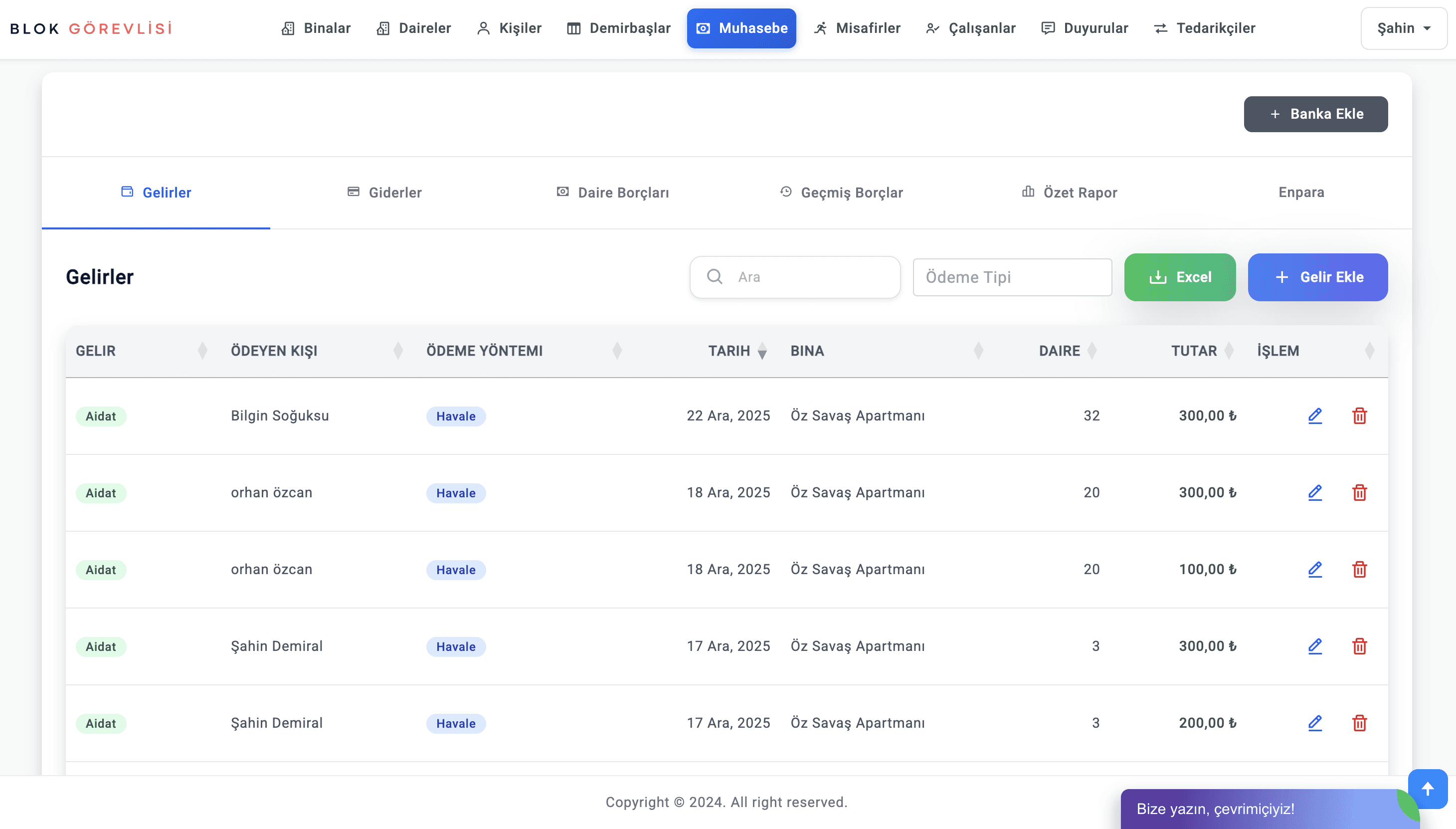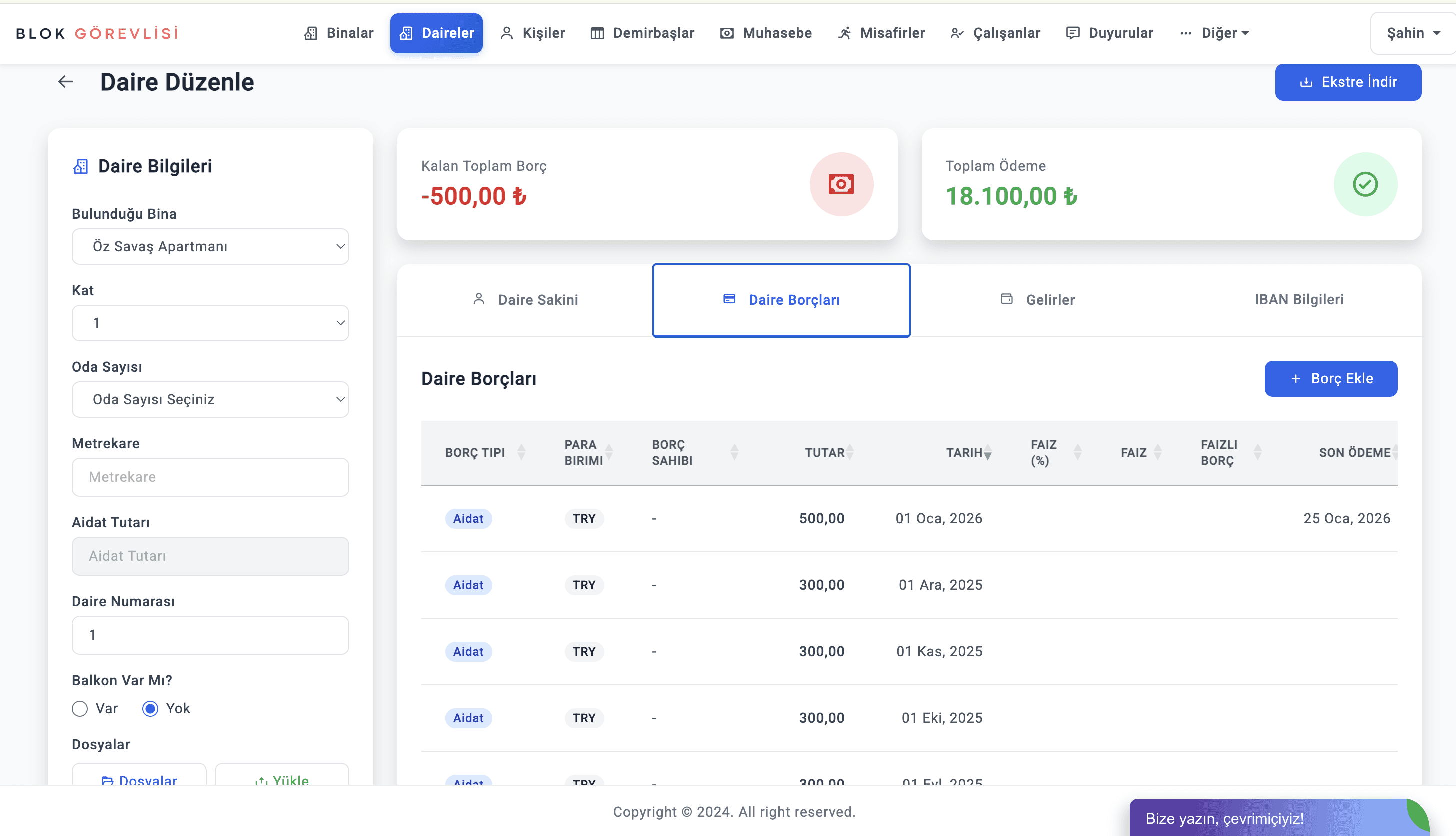 Blok Görevlisi’nin aidat programı modülü sayesinde hangi dairenin ödeme yaptığı, gecikme durumları ve toplam tahsilatlar anında görülebilir. Ayrıca bu bilgiler rapor olarak dışa aktarılabilir.